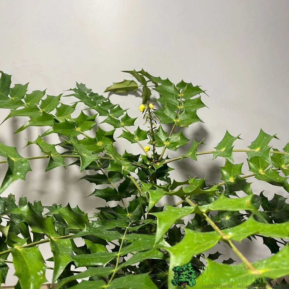 Mahonia ‘winter sun’ is a rather exotic looking shrub with a fanning habit but on a horizontal plane, almost stacking with each layer of foliage. It produces flower spikes that are coloured a contrasting bright yellow against the dark green foliage. These make an appearance during the winter from as early as november through to febuary in late examples and come with a light and delicate fragrance. It is perhaps a more compact variety of mahonia, with a smaller spread than some at around 1.5m fully mature and a height of 2.5m.