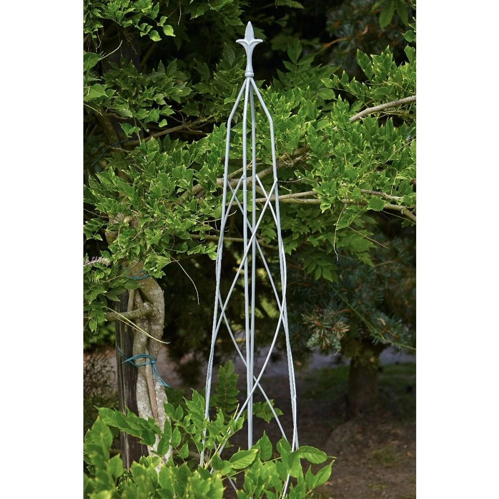 A one piece robust plant support with a contemporary structure shaped obelisk with final top.